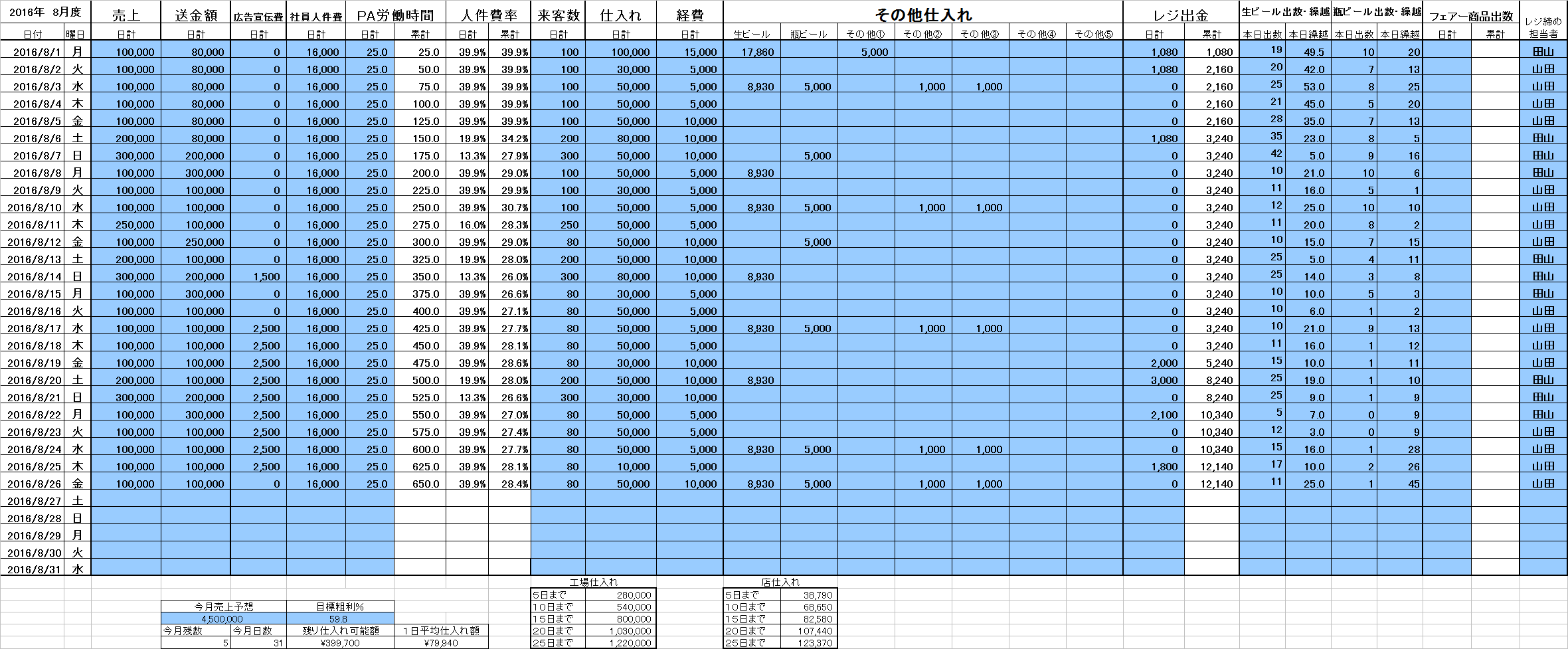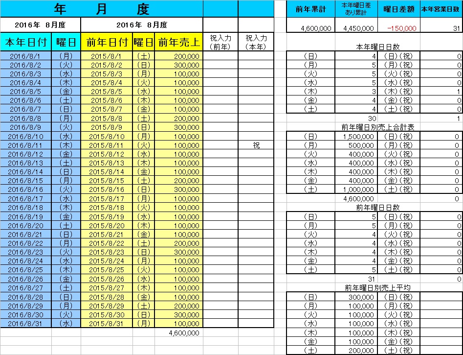 今年の8月は11日が新たに祝日になりましたので、前年の土日の平均が売上目標のベースになるように設定してあります。