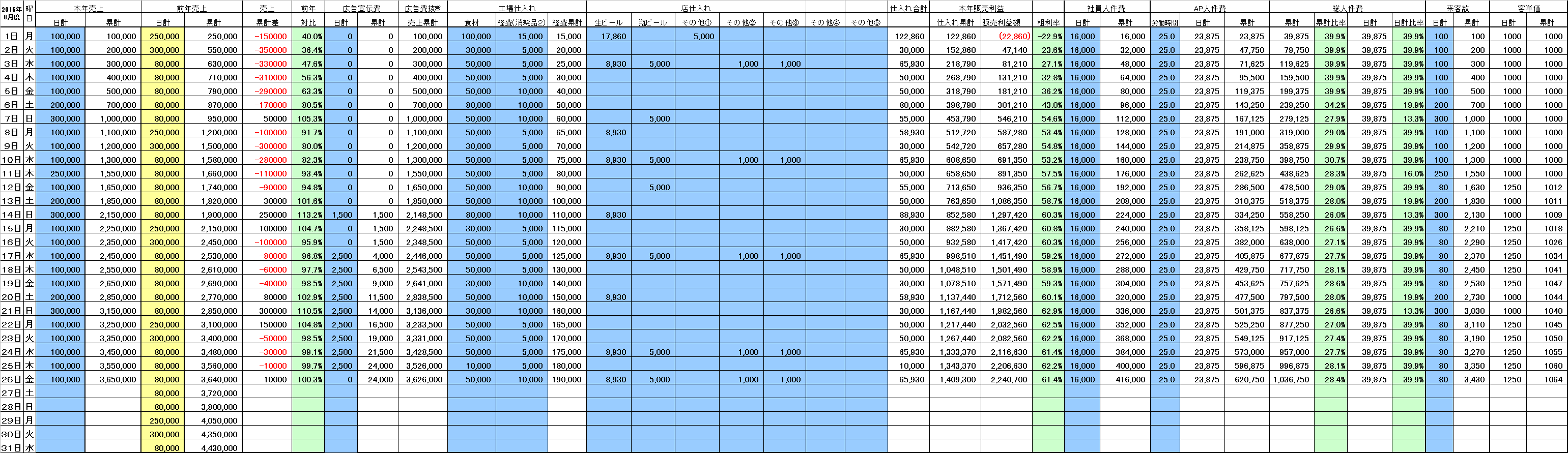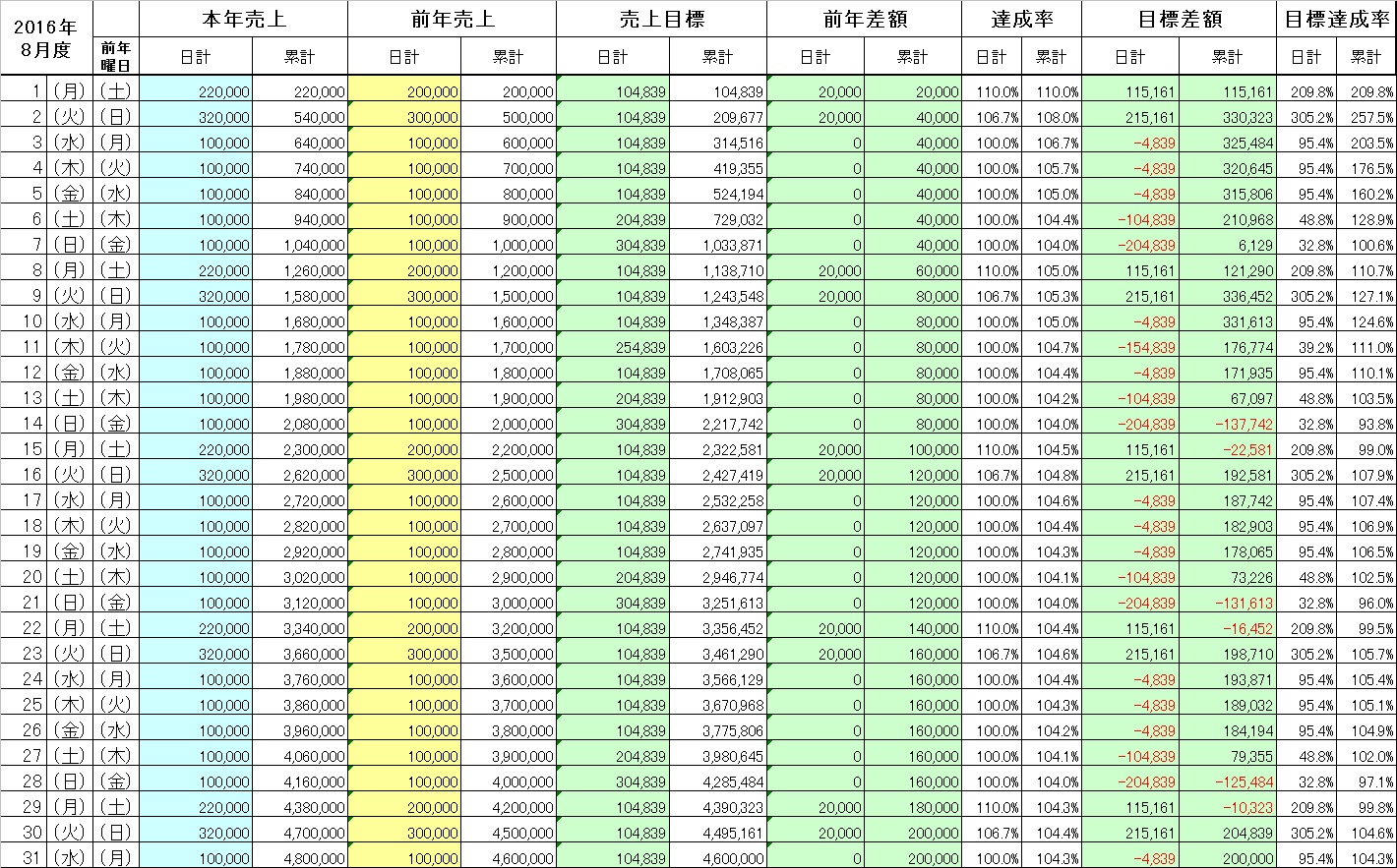 (※前年に対しての曜日差も考慮して土日が多ければその分は当然プラスに、少なければ100%達成するための不足額を自動で日々の売上に反映させるように設定)