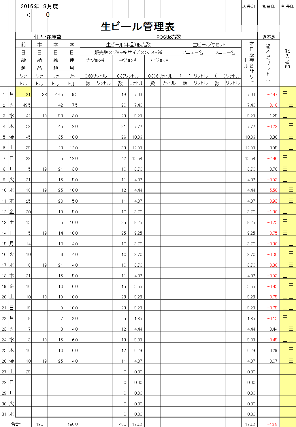 そして最終的には前年対比100%達成するために曜日毎の売上目標を自動計算するように設定してあります。