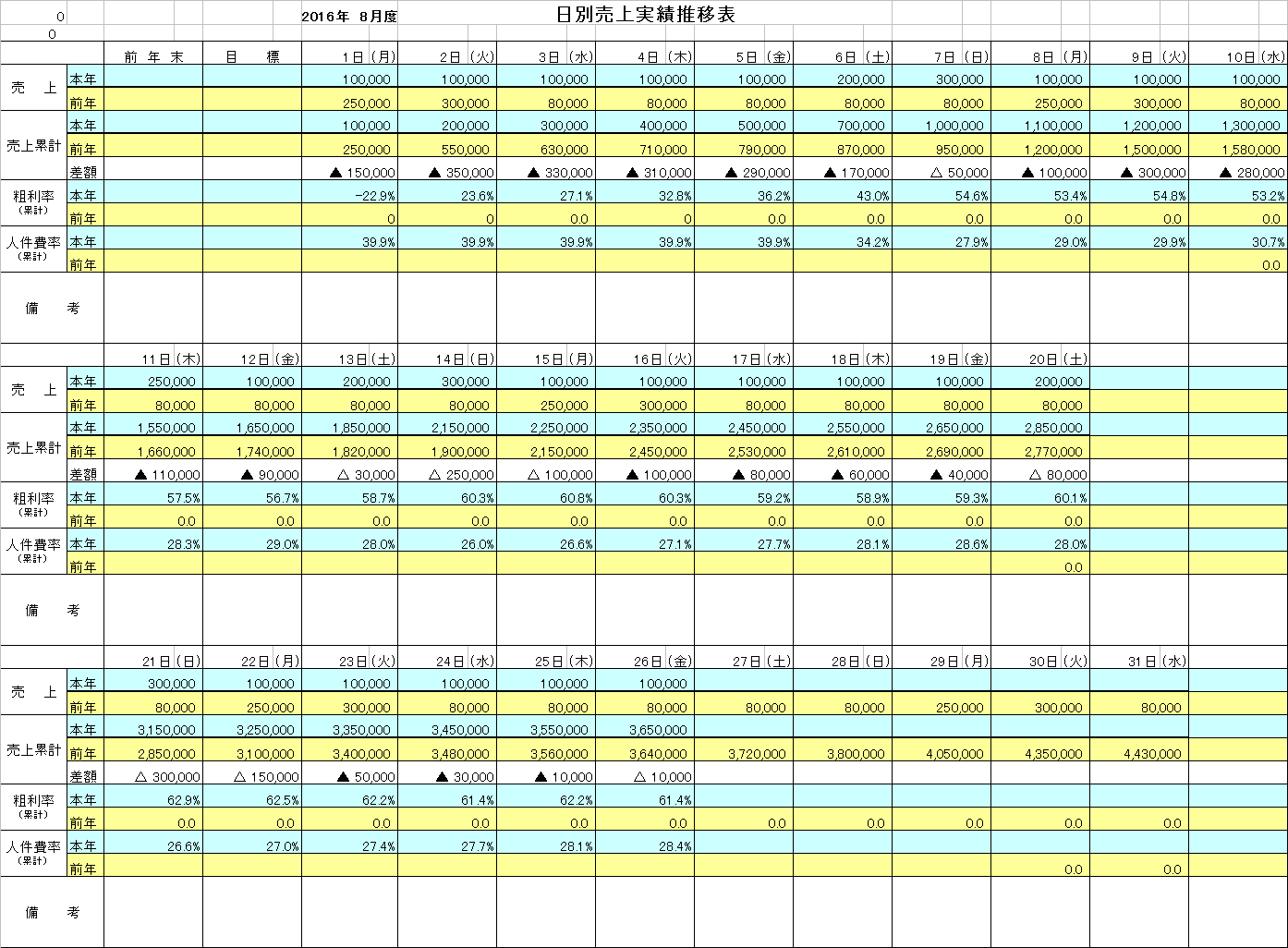 ですので、前年売上を入力した後は毎日その日の売上を入力するだけでOK!いちいち電卓で計算することなんて一切不要!差額も前年対比も目標差額も目標対比も達成率もすべて自動で計算!!